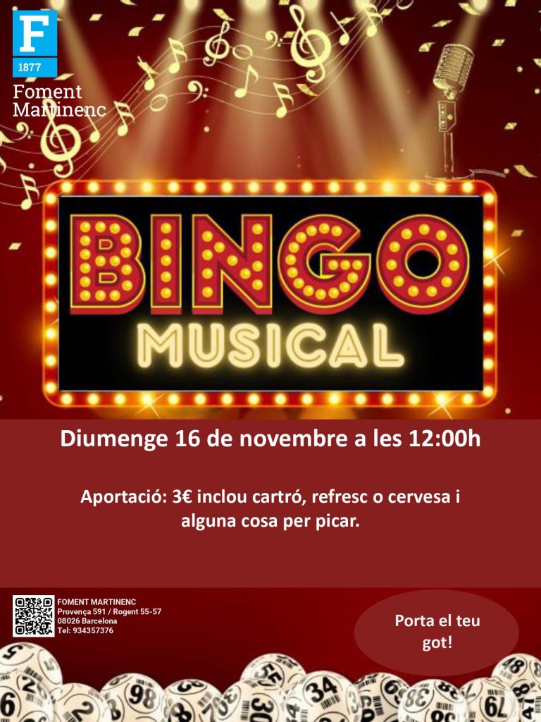 El Bingo Musical més divertit torna al Foment. Serà el 16 de novembre a les 12.00h.